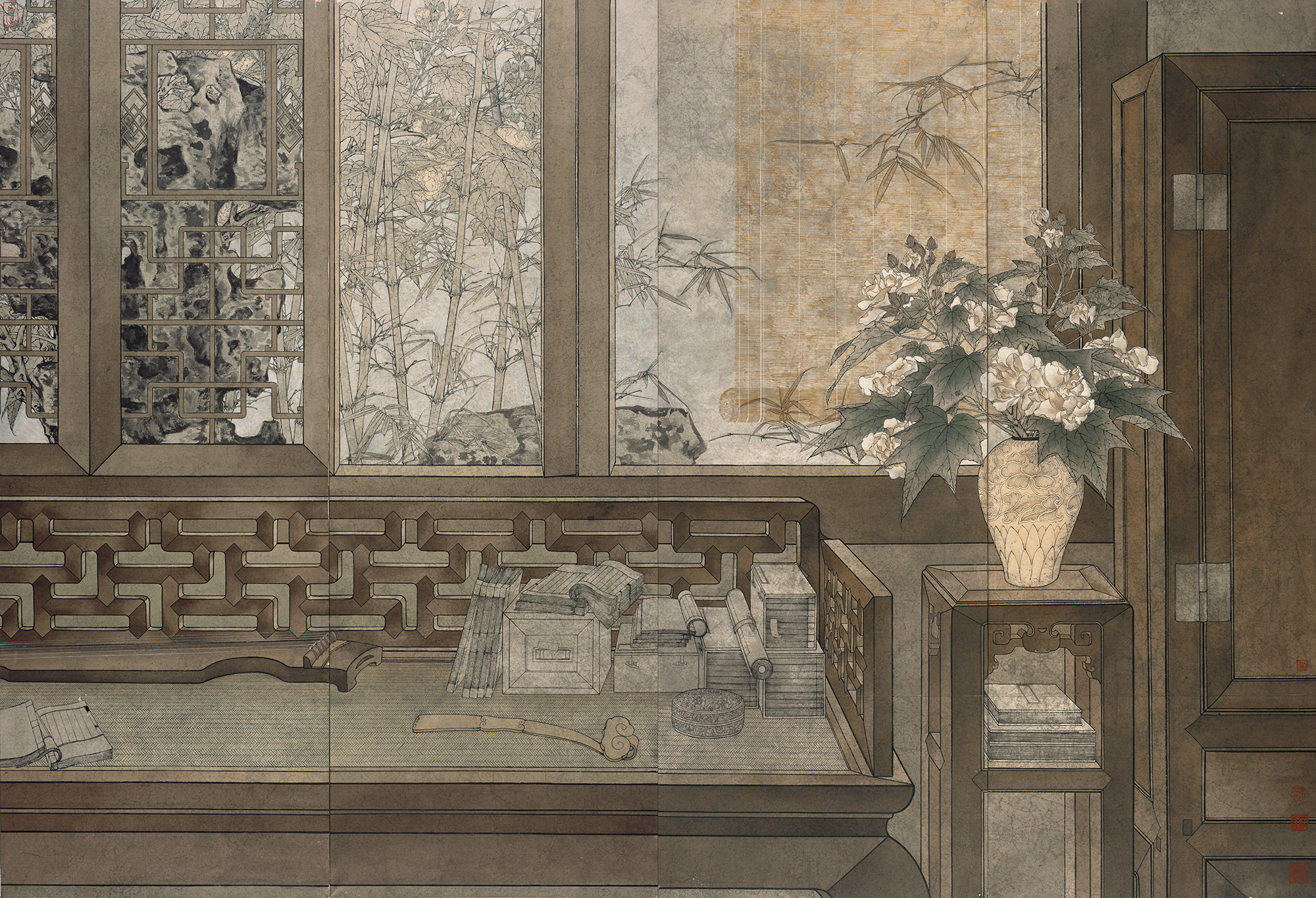 鄭力先生近年喜作金箋園林寫生,筆墨鮮活潑辣,但又呈現一種時光流逝的清靜虛曠。園中的迴廊屋舍,庭間花樹竹石,皆恍惚變幻,難以定格。其婉約微妙處若即若離,有如水中之月、鏡中之花,隨心境起伏而興沒。
