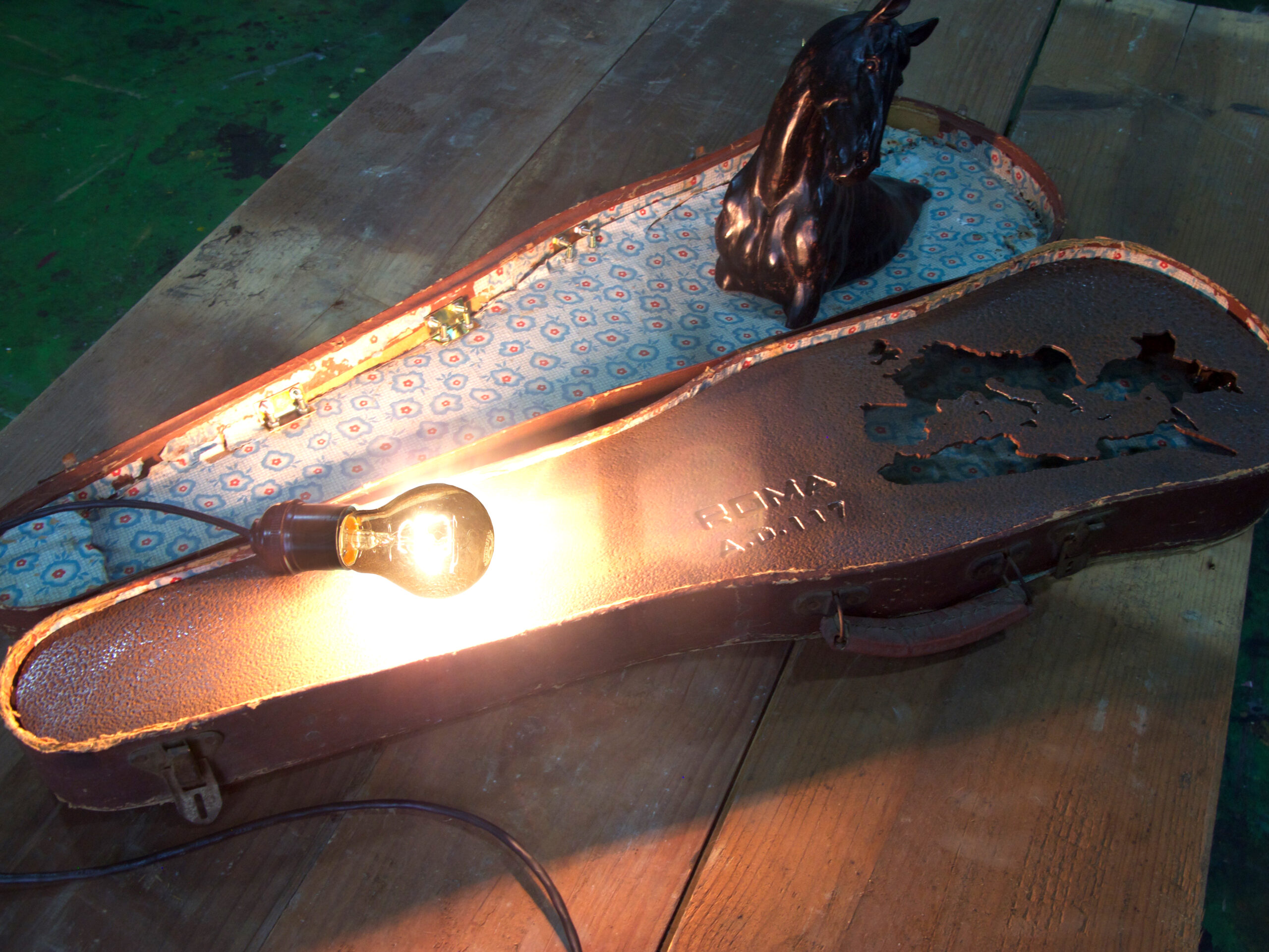 Installation: Iron, Resin, Light Bulb, Violin Case, Metal