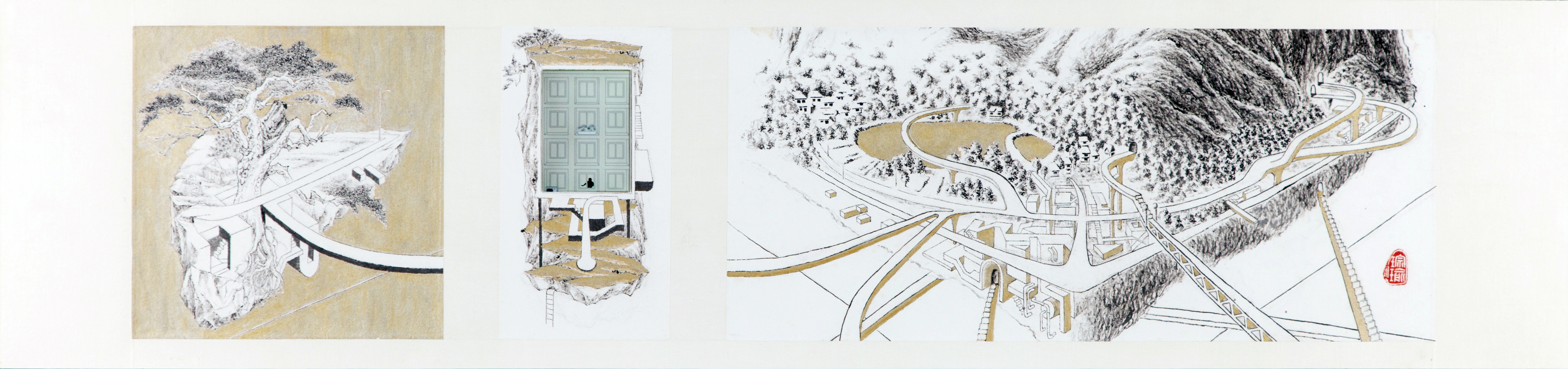 蒙古藝術家Dagvasambuugiin Uuriintuya的山水畫華麗魅惑,畫面紋理如織錦般豐富,將山巒和人類存在的脈絡逐層揭示,精緻與力量兼而有之。內地藝術家嚴善錞和王川各自使用獨特的藝術語言,以半抽象手法凝視大自然一角,或是杭州的一個小蓮塘,或是魚兒游於糾結的蘆葦之下。藝術家以此揭示大自然看似無心的畫面裡蘊含的耀目能量。北京水墨畫家徐龍森以氣勢磅礡的巨型書畫見稱。展覽中的小幅水墨金箔紙本,用筆細致,把山脈的厚重凝聚在畫面之中。