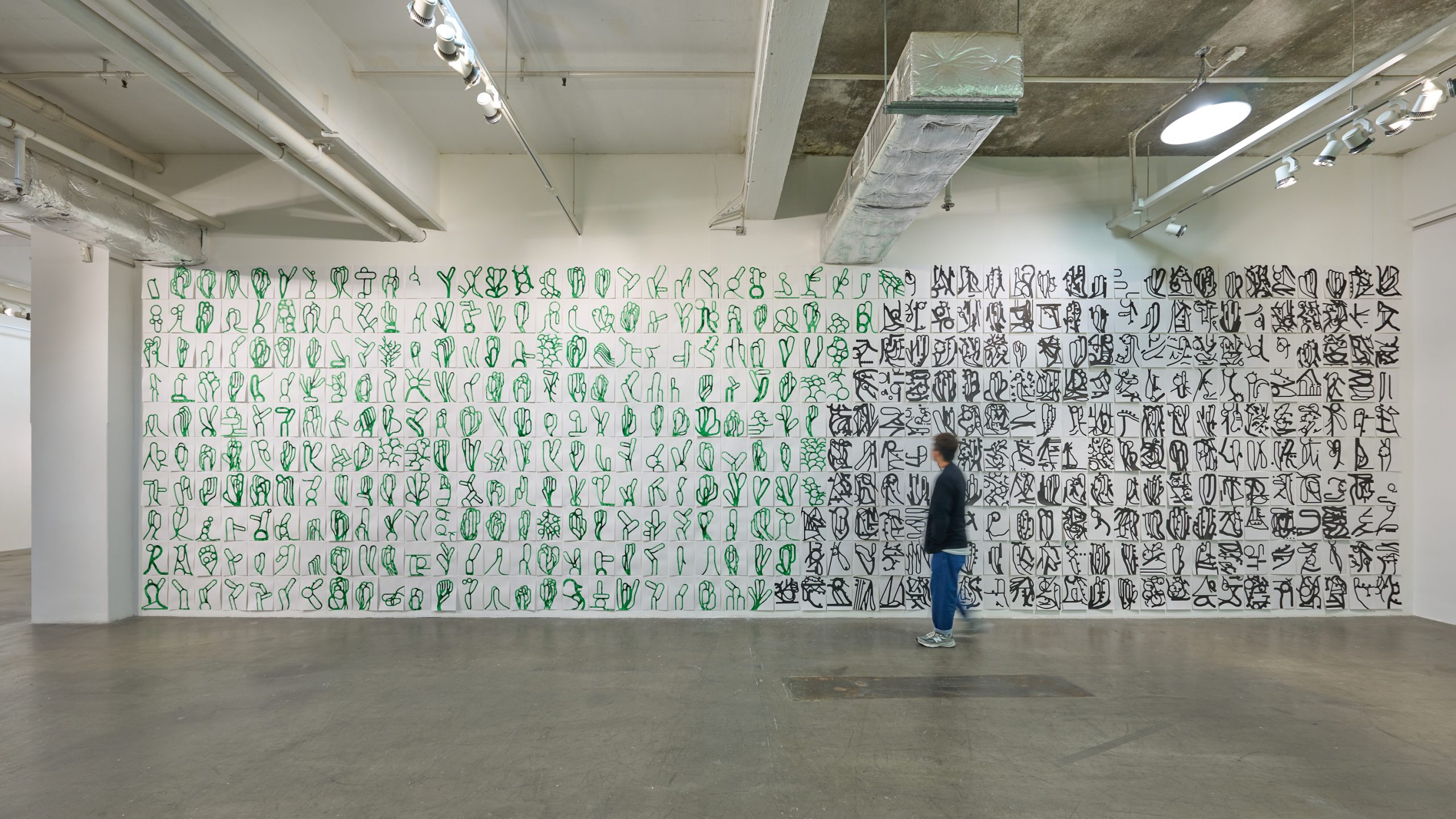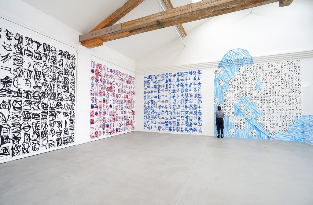 Christian Schwarzwald is interested in the writing of words as an act of drawing which, as a system of gestural practice, draws forth specific realties. He has produced many ‘sets’ of gestural technique, each of which, like an alphabetic language, develops a schematic vocabulary that may be used to compose ‘essays’. The advantage of the alphabetic language is its relation to the human voice; any number of words may be created with a limited set of phonetic signs, and the artist hints at this feature in his freely arranged sets of serial paintings, even though his interest is to explore the non-vocal dimension of the ‘alphabet’. In this exhibition we see how the artist’s ‘alphabets’ might be turned into graphic icons like the GROW series, or how they may appear to coax ideographic words out of unidentifiable ‘objects’ like the MONONO drawings. Reversing the process of ‘writing’ on the blank sheet, the artist has also developed a special technique by applying a vacuum cleaner to the ‘un-formed’ colour surface of painted monochromes. By wiping across the surface with gestural strokes that hoover up colour pigment to create blank lines on the canvas, he reveals, like the dawn of Creation, hidden forms beneath.