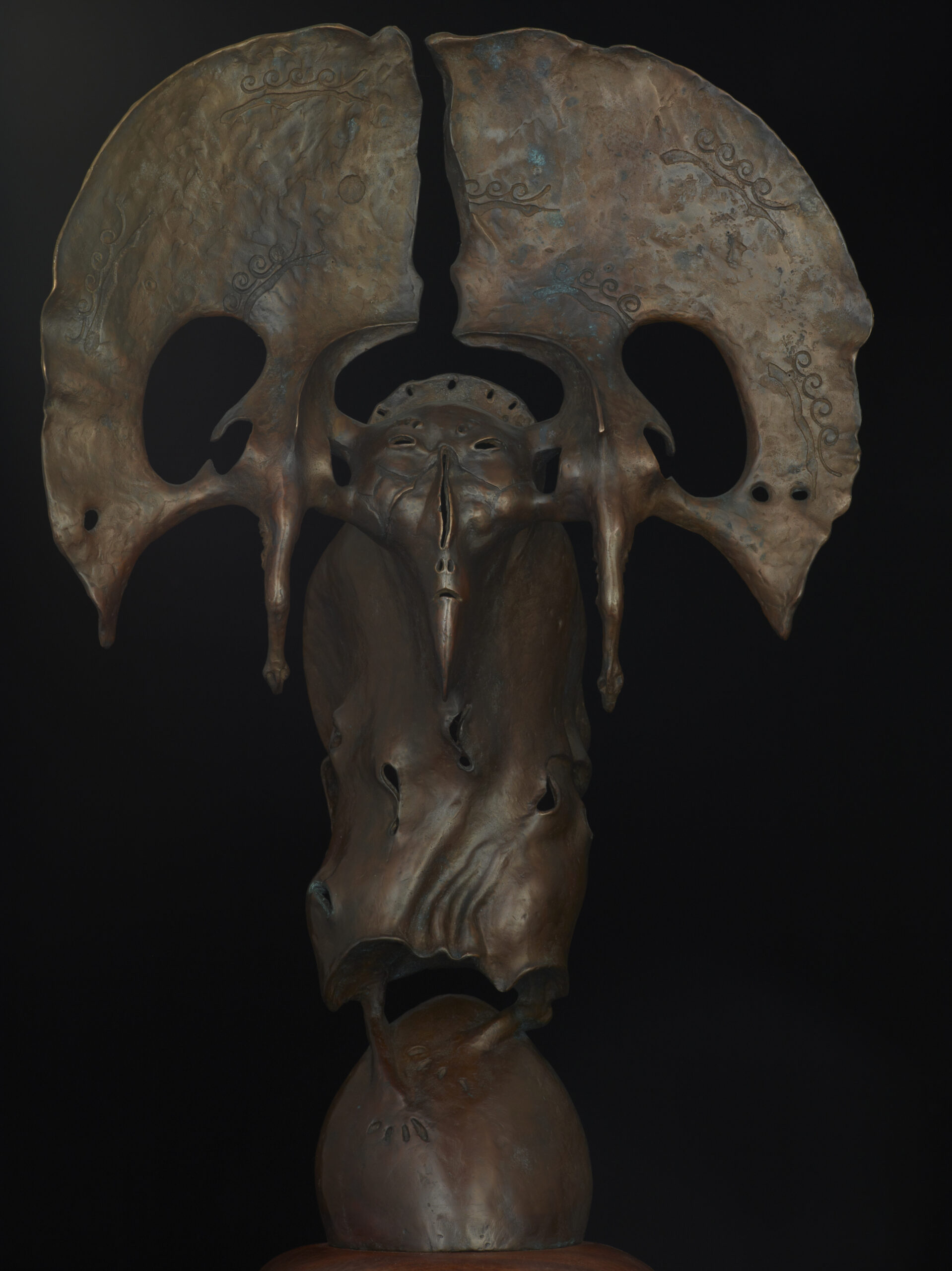 「游牧」與「農耕」,自古是一對互賴與衝突的生存模式。二者因為文化截然不同而互相抗拒,但又因為對立而更能得到啟發。遊牧文化承傳的薩滿基因尤其久遠,帶著人類對天地最原始的領悟。可惜亞洲的薩滿傳統被近世的科學主義迫害,只倖存在邊緣的文化記憶與習俗中。雕塑家達西.那姆達科夫的造型靈感源自家鄉布里亞特民族的薩滿傳統,他重新打開了神秘奇璚的心靈世界,影射了宇宙的畏怖和不測。今天新生代的魔界、變形、邪靈想像、或許是對薩滿的最新回歸。
