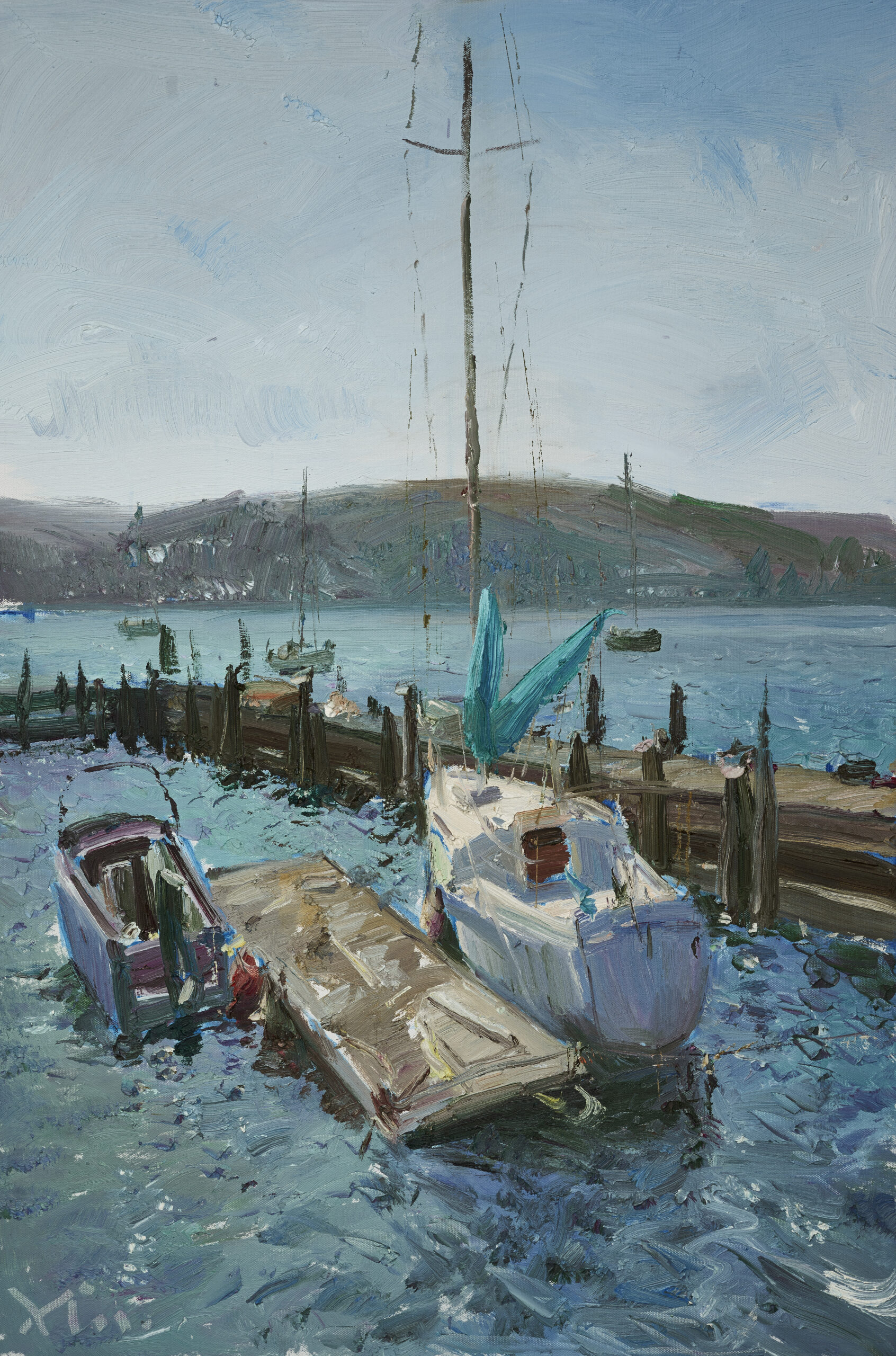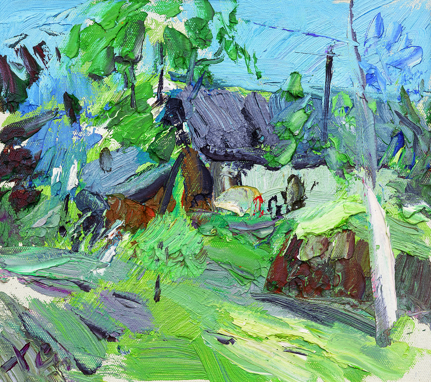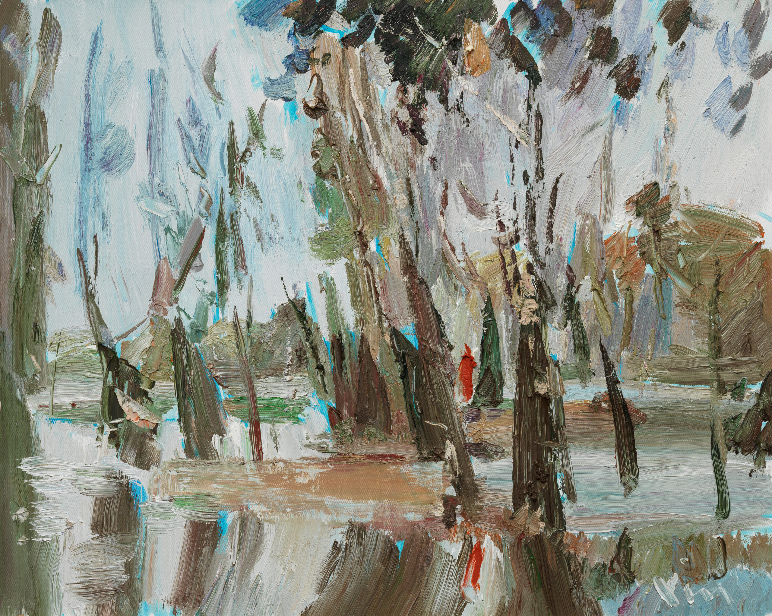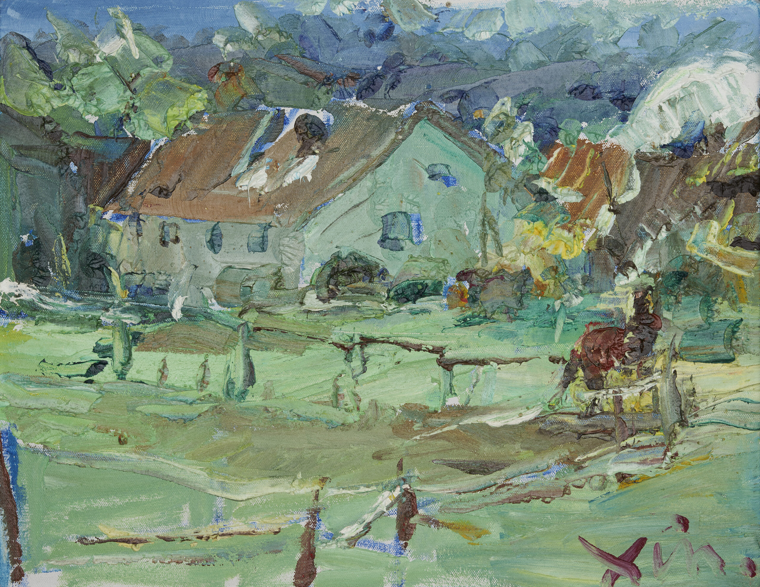 當年油畫訓練班的畫家大多有特殊背景,諶先生更跟上一輩的傳統文人有家族淵源。他的外祖父昆仲是著名的漢陰三沈,沈尹默沈士遠和沈兼士,從小家中往來的都是民國時代的名士。對書畫的興趣也使諶先生的油畫傾向意筆的趣味,並發揮對造形的獨特掌握。於用筆的潑辣痛快他比俄國的陽光派和法式印象派都更澈底。用筆跟造形是分不開的,諶先生的造形是以色塊直接營造形體,如果以筆法來談,可以說他是把骨和肉都合在同一筆內,以致行筆與造形和合無間。畫中景象與運筆的節奏也無法兩分,所以諶先生的風景生趣盎然,律動變化協和於作者情緒。畫面潔淨而淋漓,沒有碍目的贅筆,讀畫人可以近賞細部變化,也能退觀全景的結構組織。