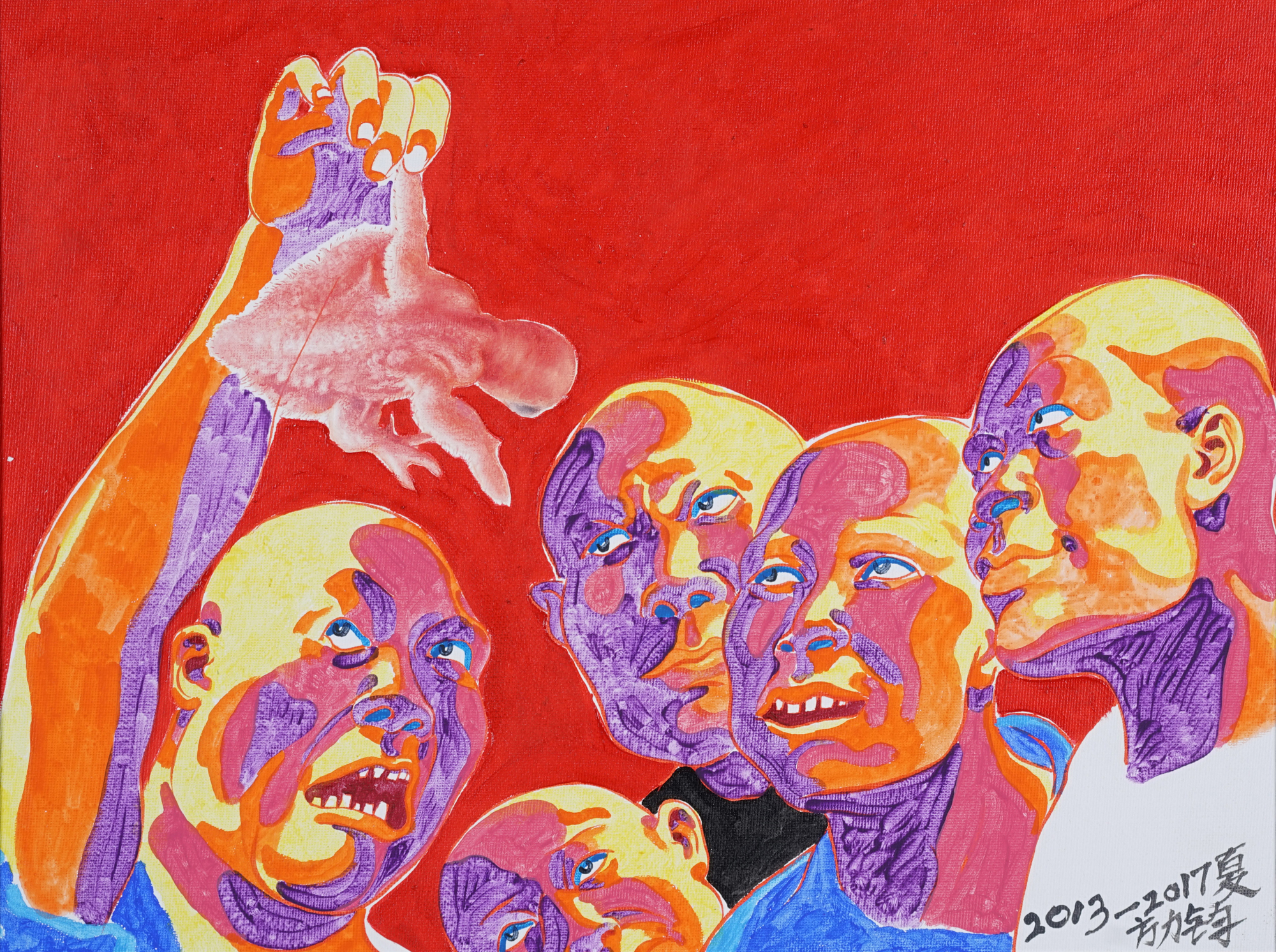 從一個帶著歷史使命的集體社會轉換到惶恐危微的個體生存感,這是方力鈞對這個時代的感受。而「人間世」這系列繪畫正是從集體社會轉型到個體生存的心理狀態寫真。一直以來,他的藝術感覺糾結於兩個構成矛盾的關係:一是集體和個人的互相依賴,二是兩者互相抗拒的協商關係。